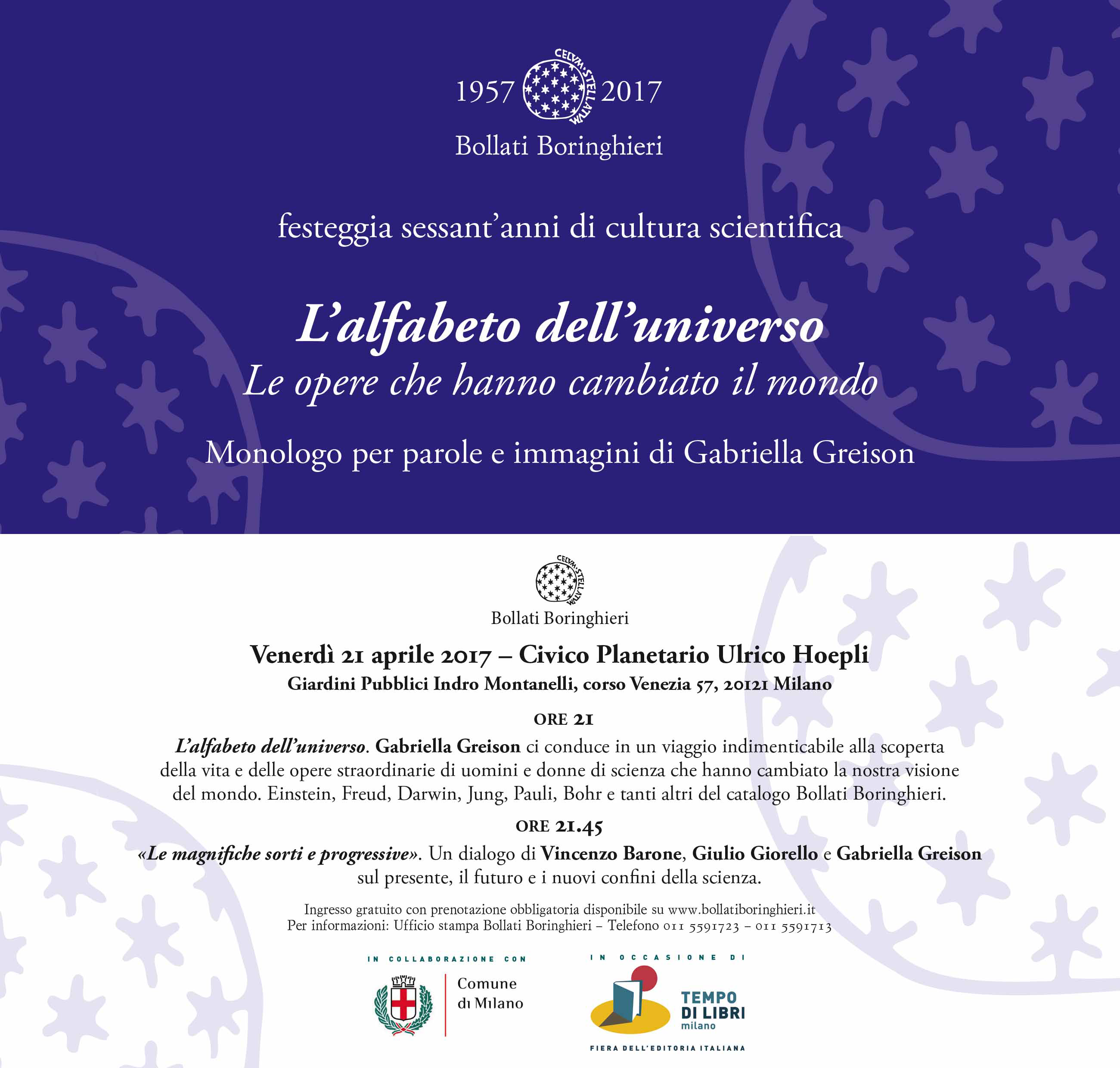 In occasione del suo sessantesimo anno di attività la casa editrice organizza una serata intitolata L’alfabeto dell’universo. Le opere che hanno cambiato il mondo, al Civico Planetario Ulrico Hoepli, a Milano, il 21 aprile 2017, in occasione della nuova fiera Tempo di Libri.